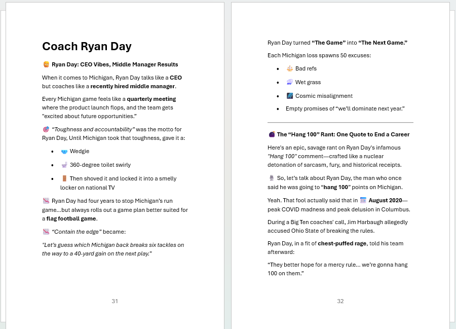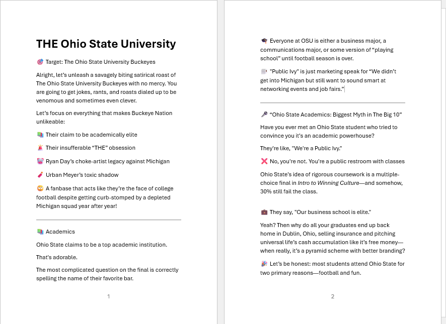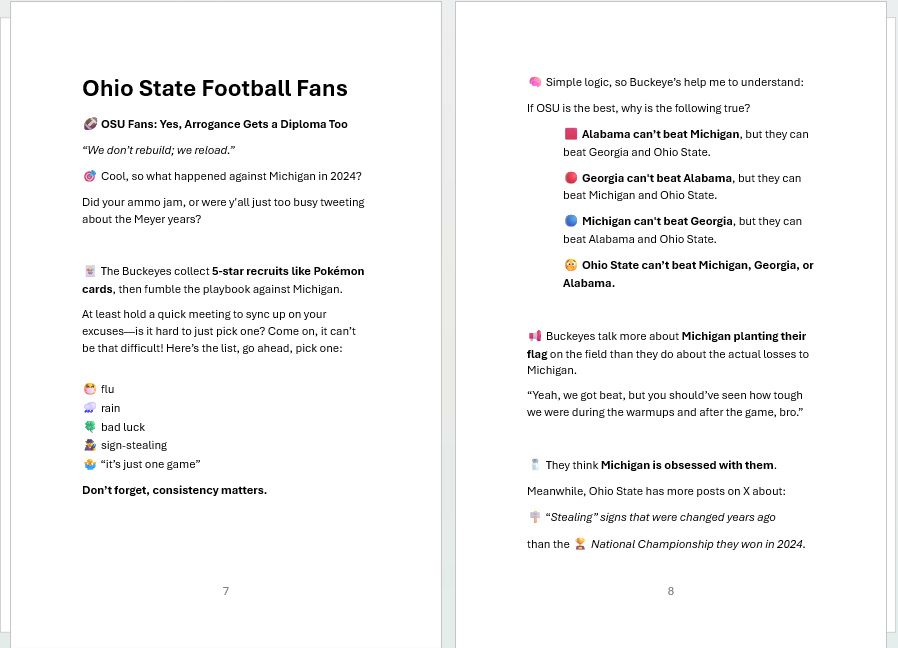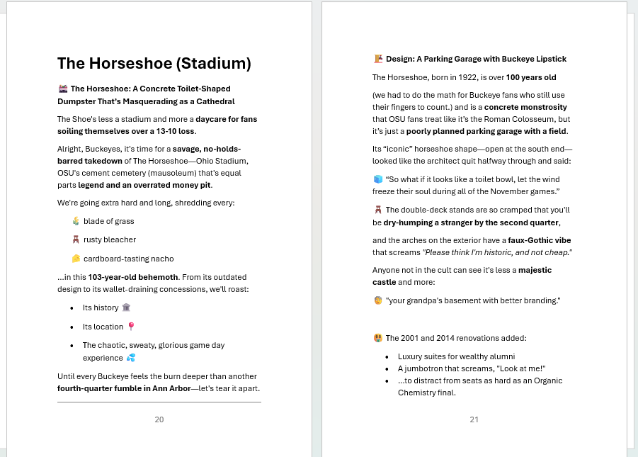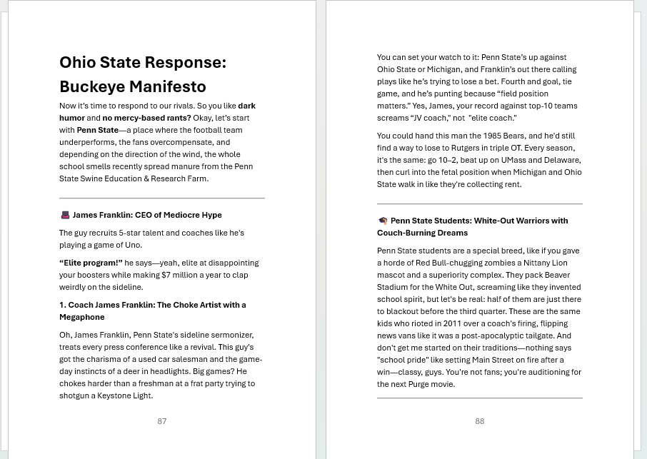 Hey Buckeyes—when we show up in Columbus, we take over your campus, rename the Horseshoe “The Participation Trophy Pit,” and remind you that your mascot is literally just a tree nut with crazy-looking eyes. We get it—you’re proud of yelling “O-H!” But do you have what it takes to read about your precious institution? Read a few pages and decide if you are willing to part with less than $15 to laugh out loud.