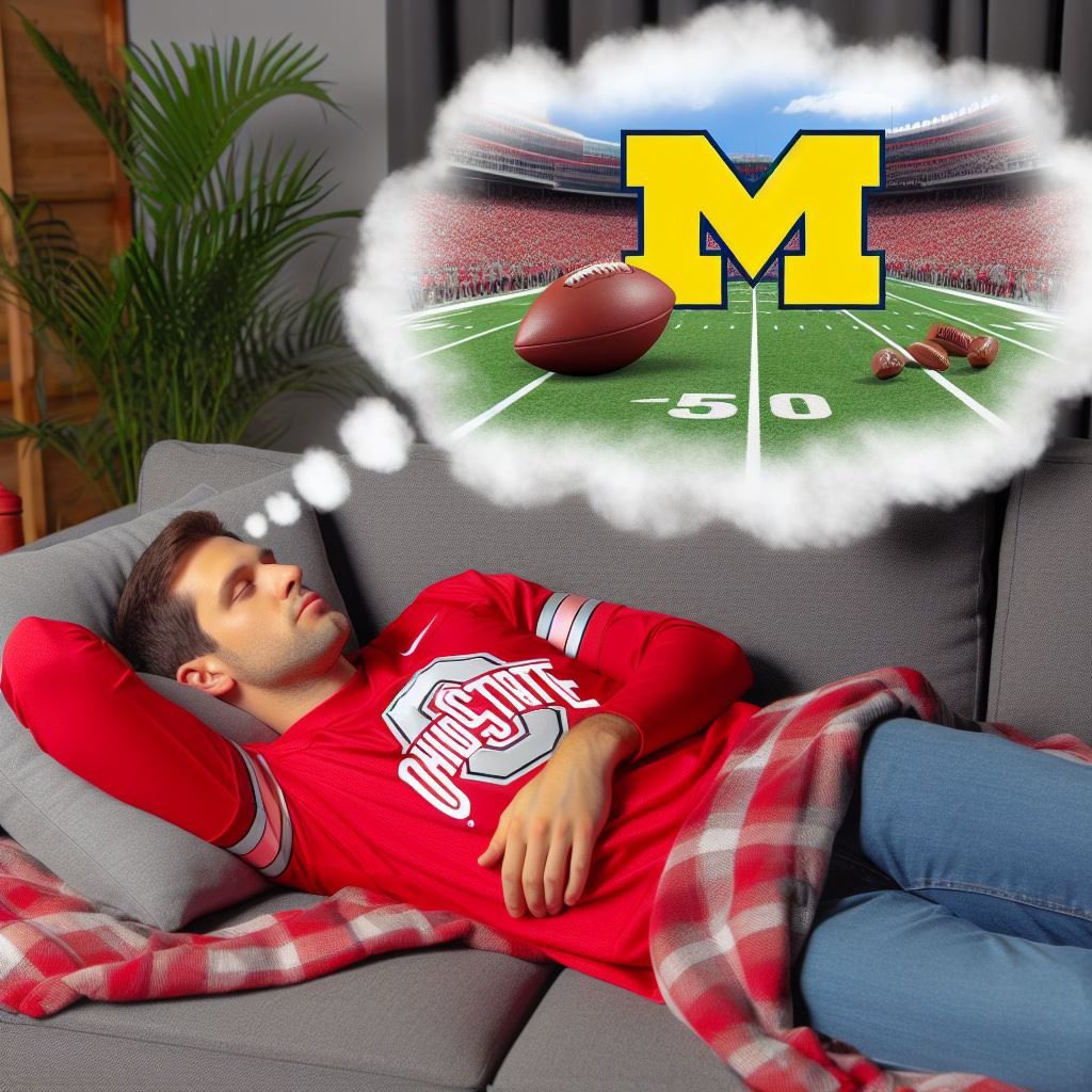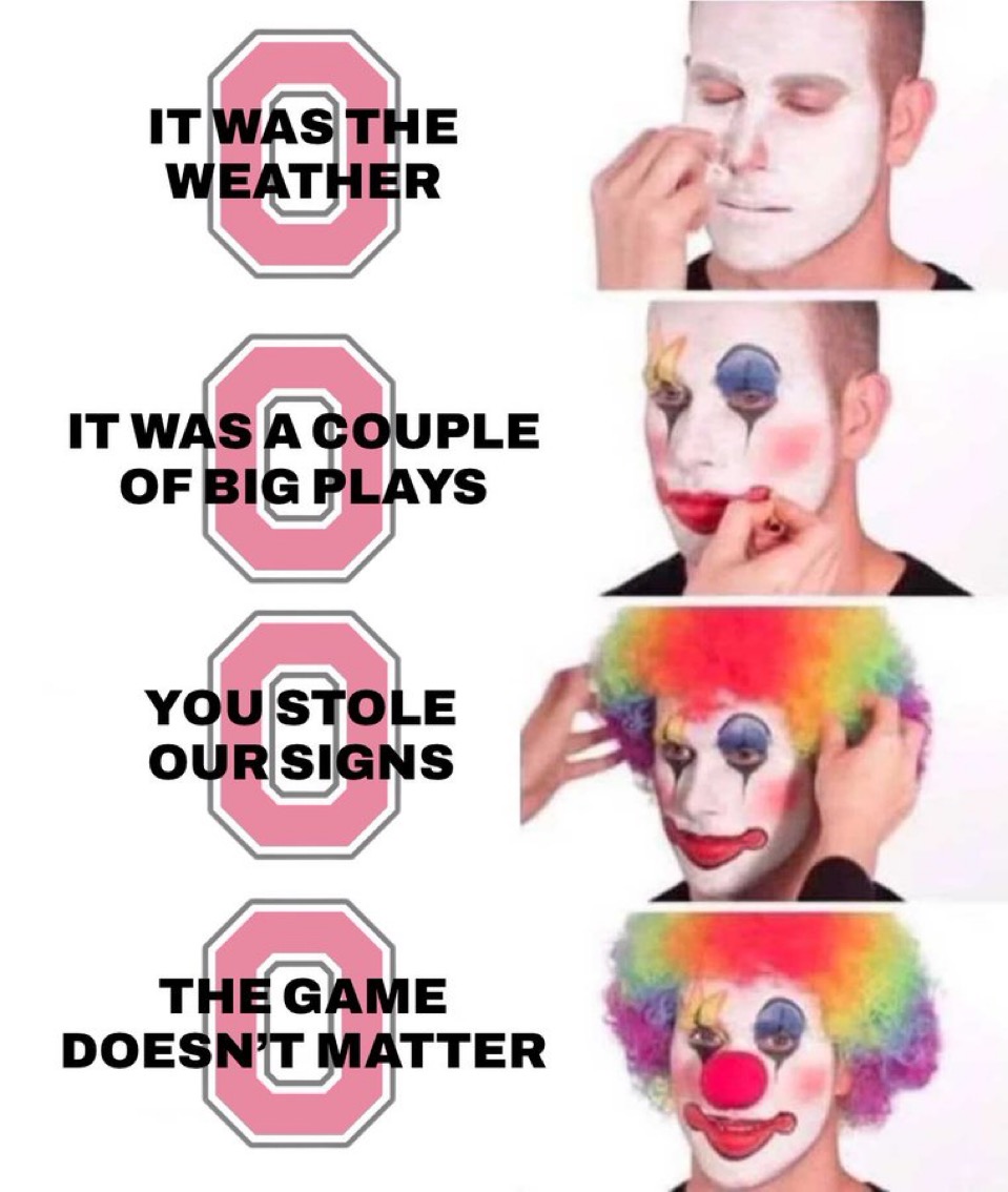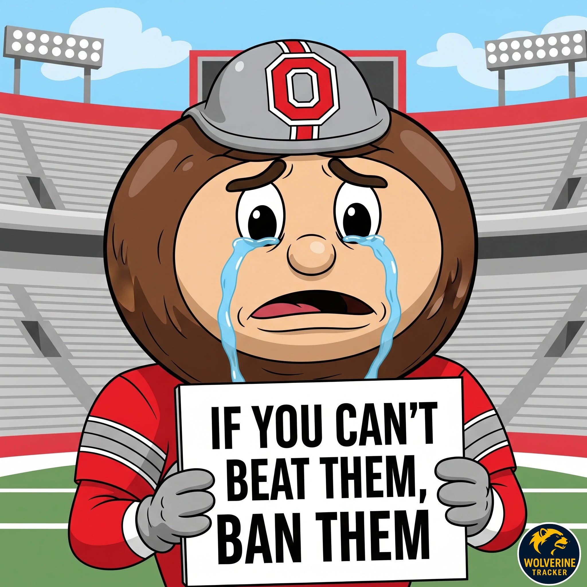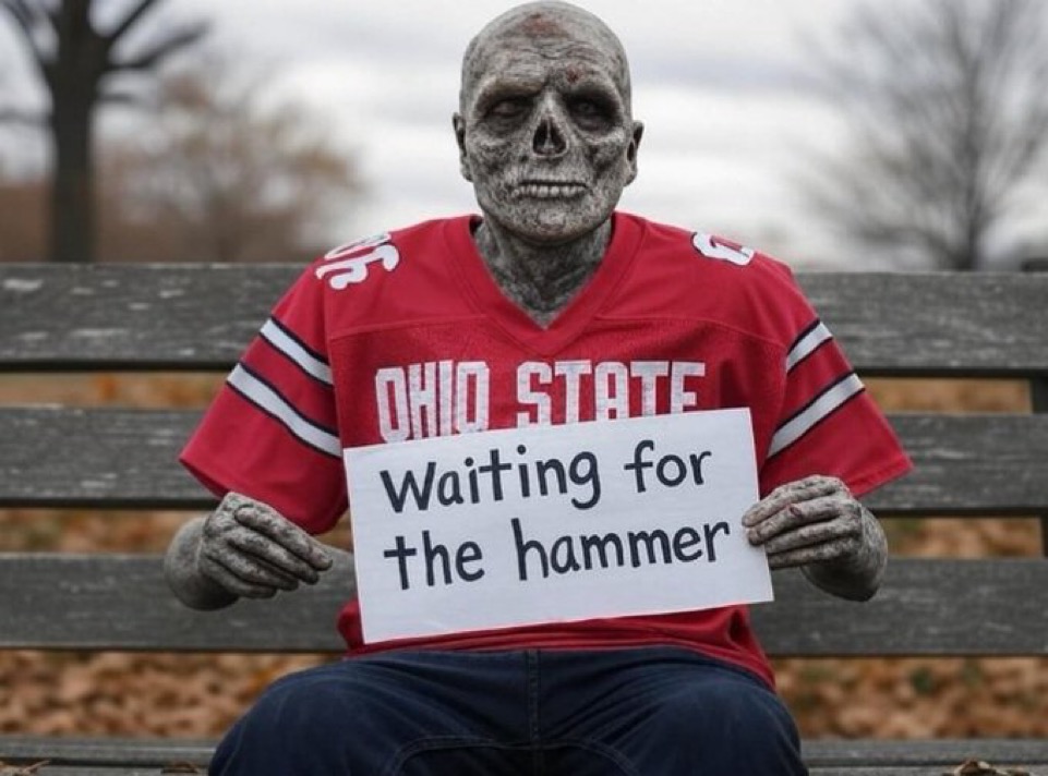 Hey Buckeyes—when we show up in Columbus, we take over your campus, rename the Horseshoe “The Participation Trophy Pit,” and remind you that your mascot is literally just a tree nut with crazy-looking eyes. We get it—you’re proud of yelling “O-H!” But maybe don’t chant it mid-arrest outside a High St. bar, reeking of Axe body spray and shame.